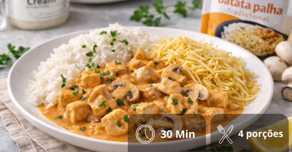 Sirva o strogonoff com Arroz Branco Zuppa e finalize com Batata Palha Zuppa, trazendo equilíbrio entre cremosidade e crocância.